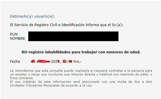En Chile, la protección de los menores es una prioridad. Cuando una persona comete delitos contra menores de edad, su nombre se registra en una base de datos pública que indica su prohibición legal de trabajar con menores de 18 años.